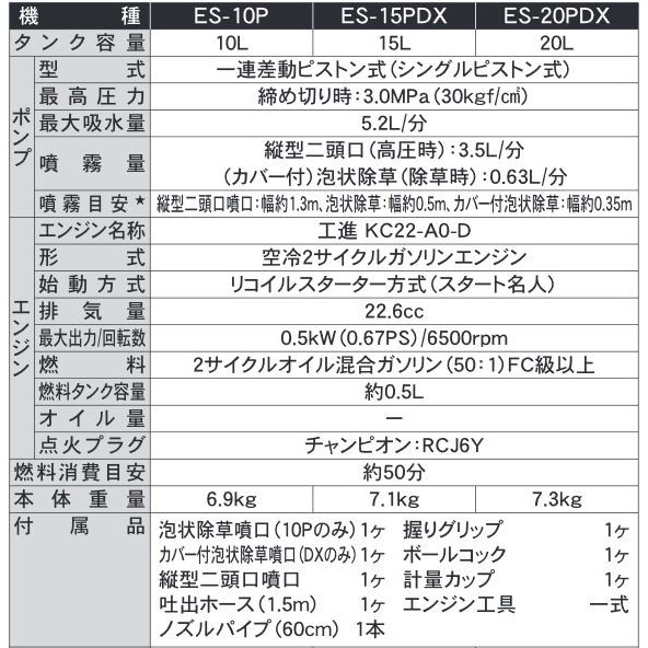 - 噴霧目安:縦型二頭口噴口 幅約1.3m、泡状除草 幅約0.5m、カバー付泡状除草 幅約0.35m