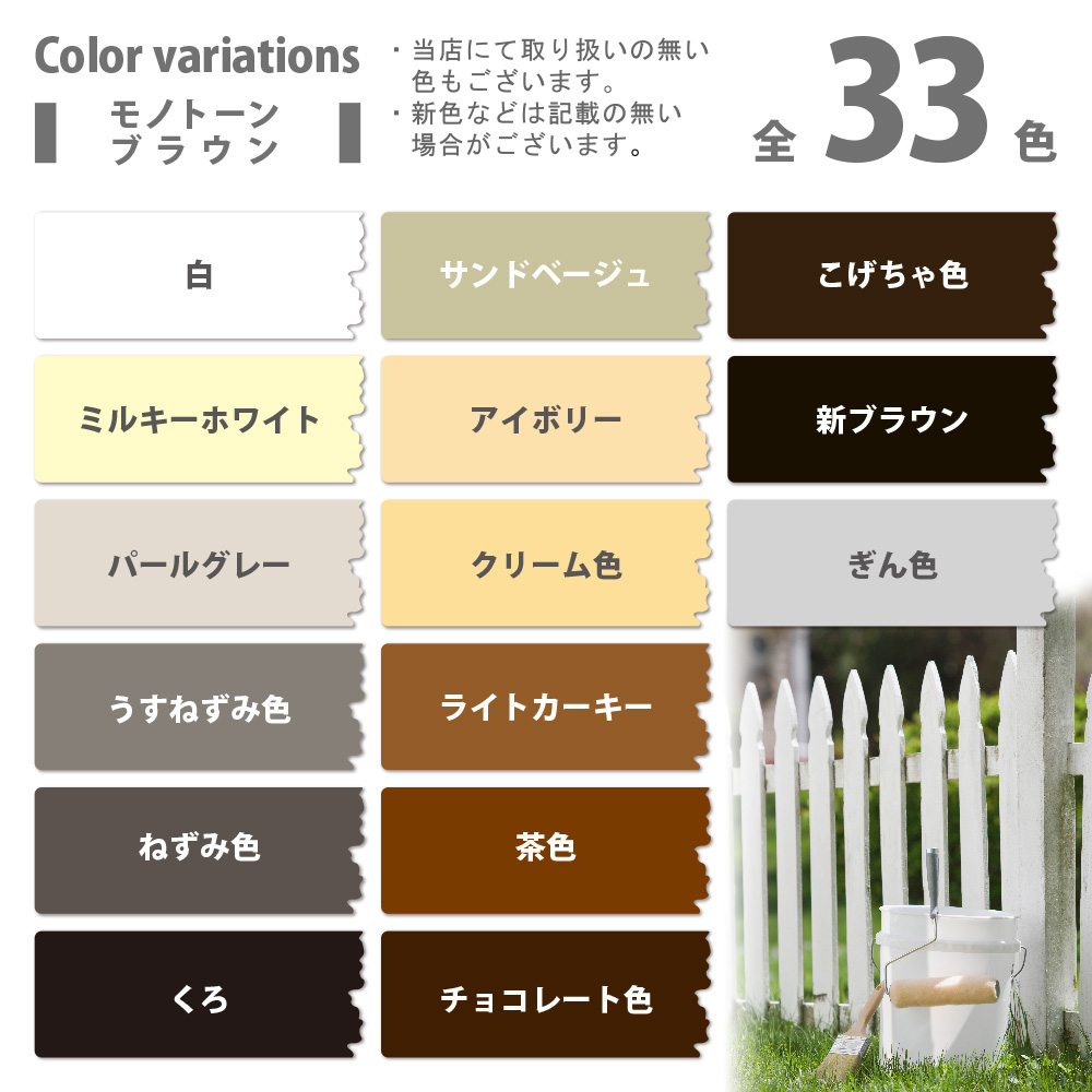 | 用途 | ●シャッター、門扉、板塀、雨戸などの鉄部およびアルミ・ステンレス。 ●トタン、セメント瓦、スレート瓦、新生瓦(カラーベスト、コロニアル)などの 住まいの屋根。 ●屋内外の木部、家具、木工品などの木製品。 ●コンクリート、モルタル面の外壁及びサイディング面(セラミック系は除く)。 ●硬質塩ビ、アクリル、FRP、ABSのプラスチック面。 |