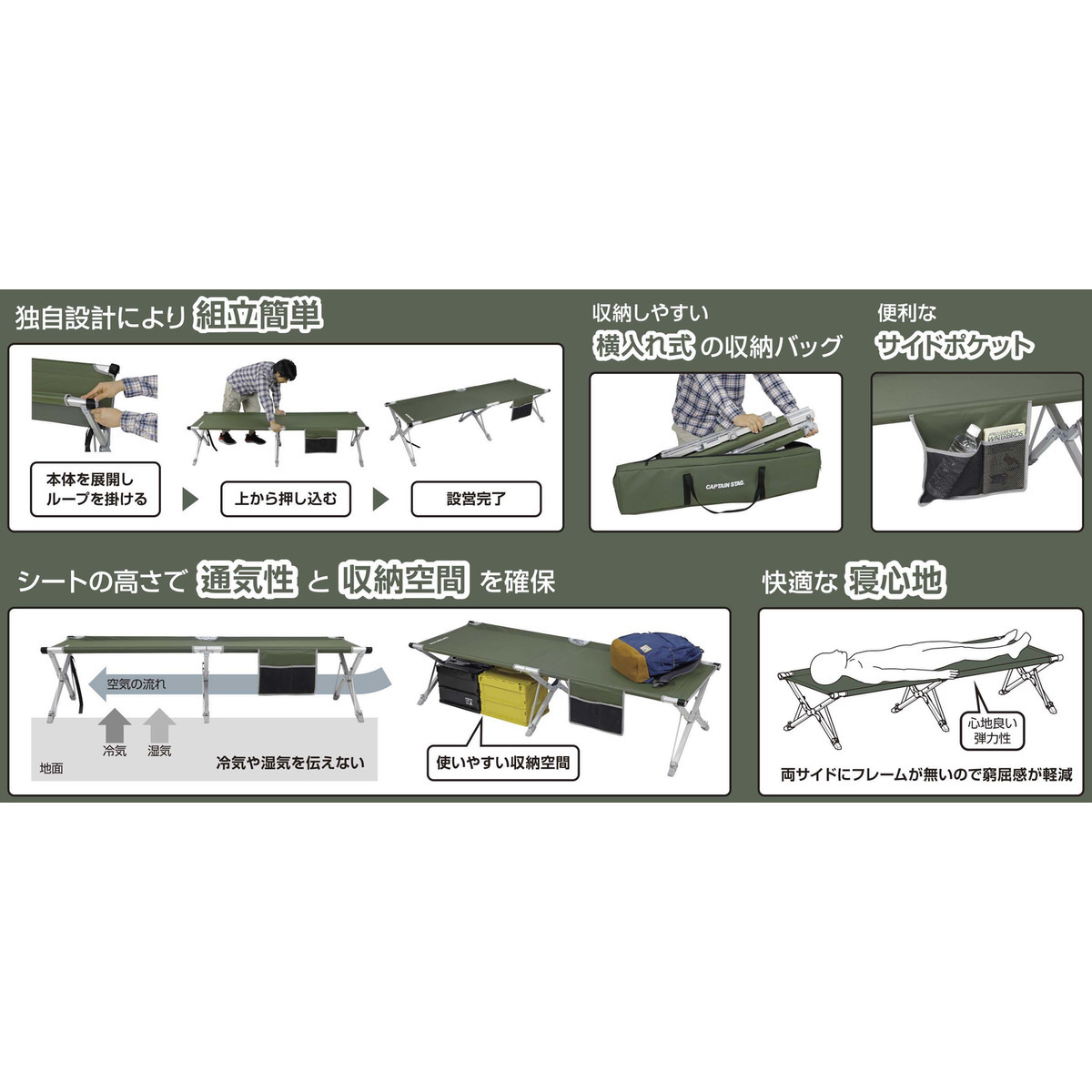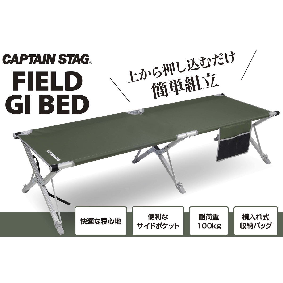 キャプテンスタッグ 簡単フィールドGIベッド オリーブ UB-2009関連キーワード:アウトドアチェア レジャーチェア キャンプチェア チェア ベンチ 椅子 いす