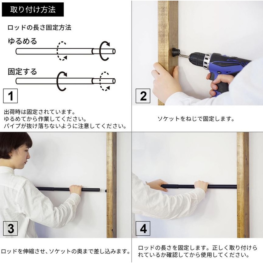 - 付属の専用ソケットをネジで柱に取り付けて、伸縮タイプのポールを引き伸ばし、ソケットに差し込むだけで設置可能。ひねるだけで長さを固定できるロック機構付きなので、一人でも簡単に取り付けられます。
