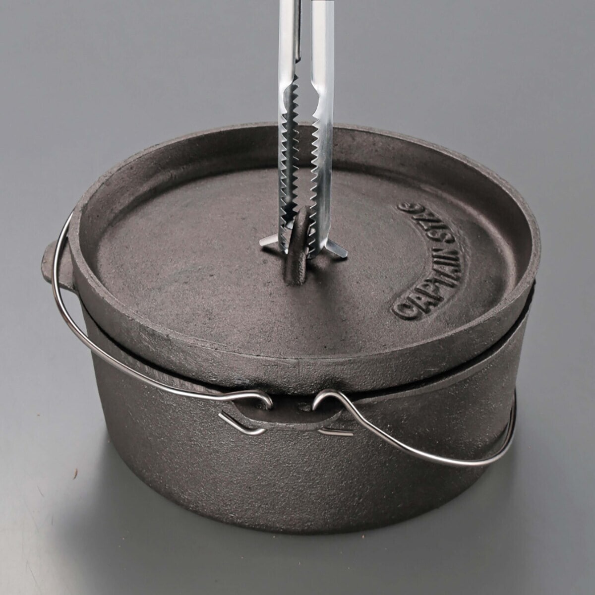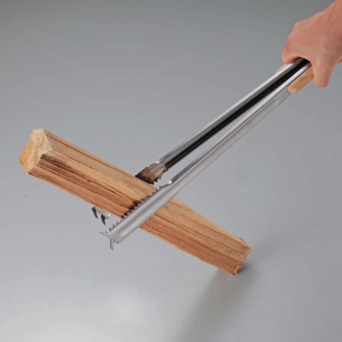 - 炭バサミの先端にダッチオーブンの蓋などがつかめる、かぎ爪フックが付いています。