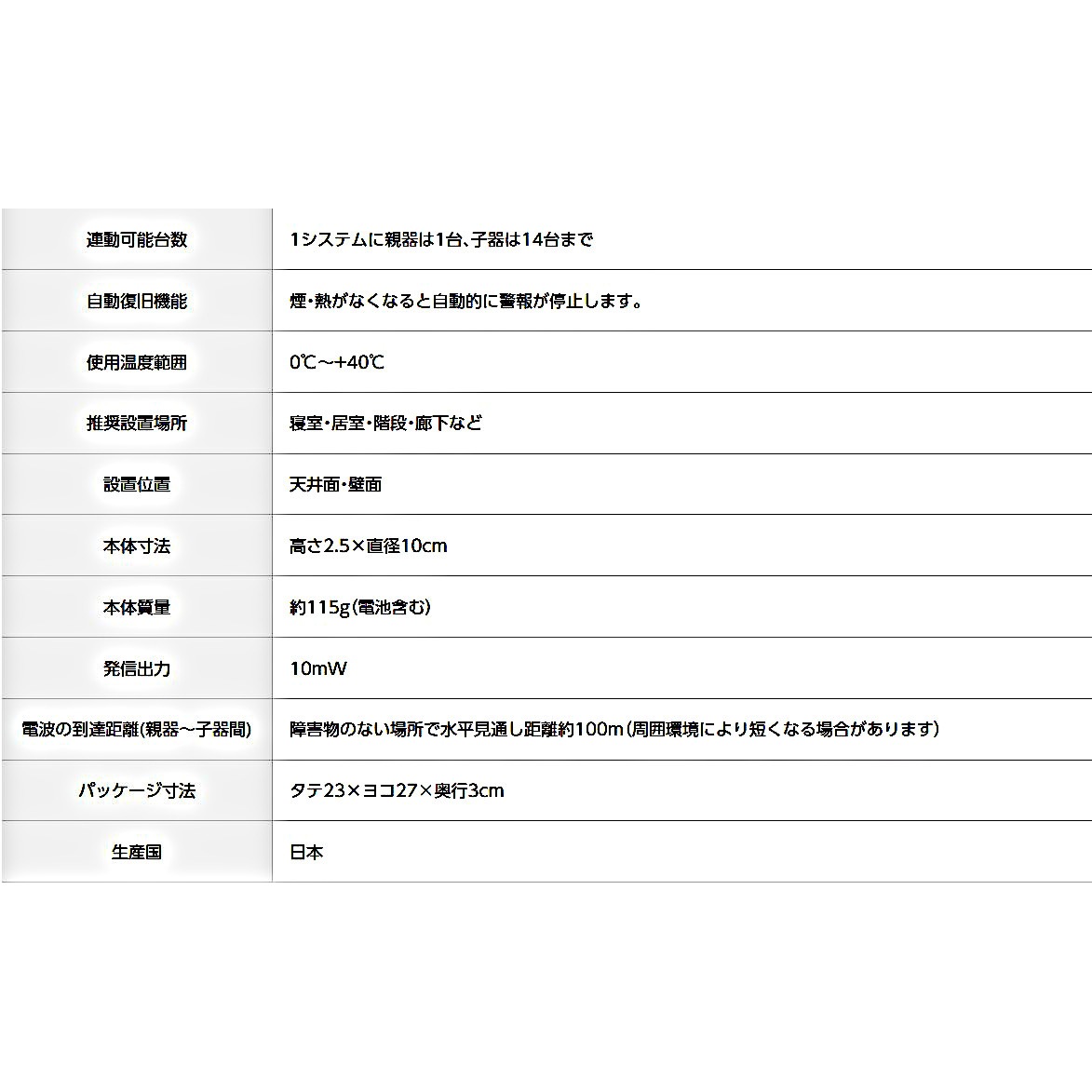 - 連動警報開始時間:発報元の警報開始から10秒程度 (環境によって20秒程度かかることあります)