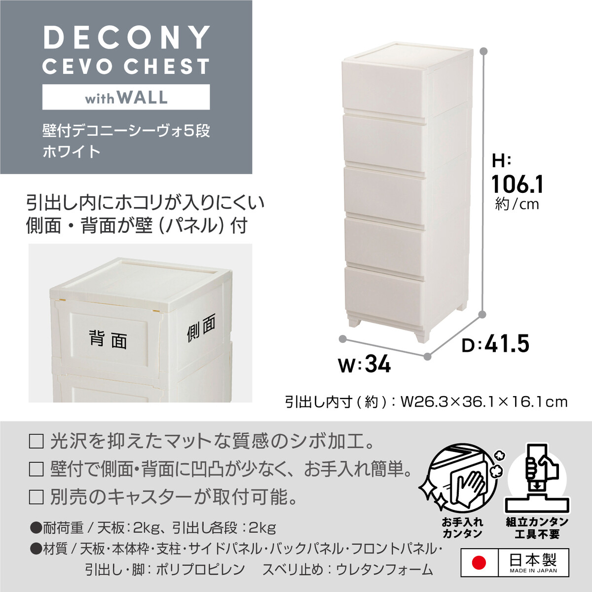 - 耐荷重:(天板)約2kg、(引き出し/1段あたり)約2kg