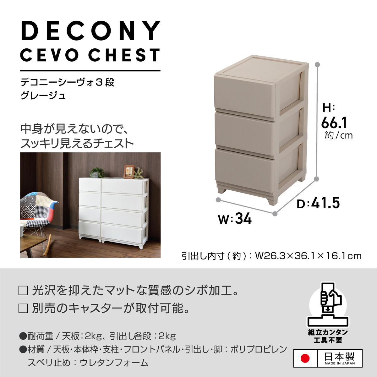 - 材質:(天板,本体枠,支柱,引出し,フロントパネル,脚)ポリプロピレン、(スベリ止め)ウレタンフォーム