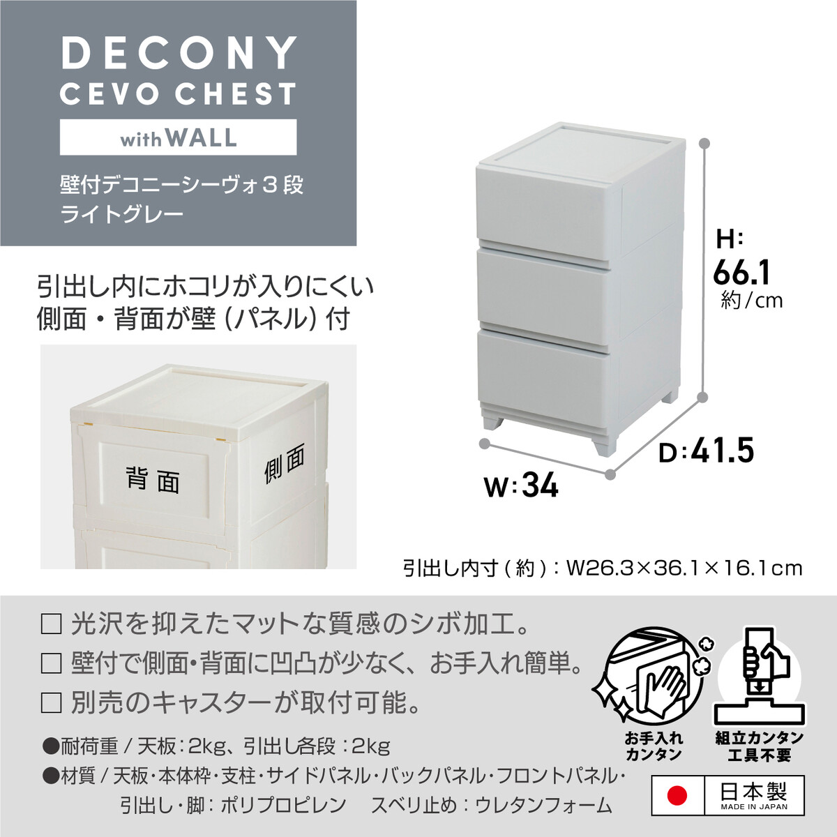- 耐荷重:(天板)約2kg、(引き出し/1段あたり)約2kg